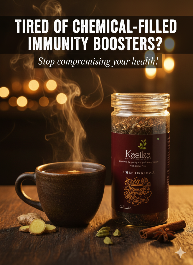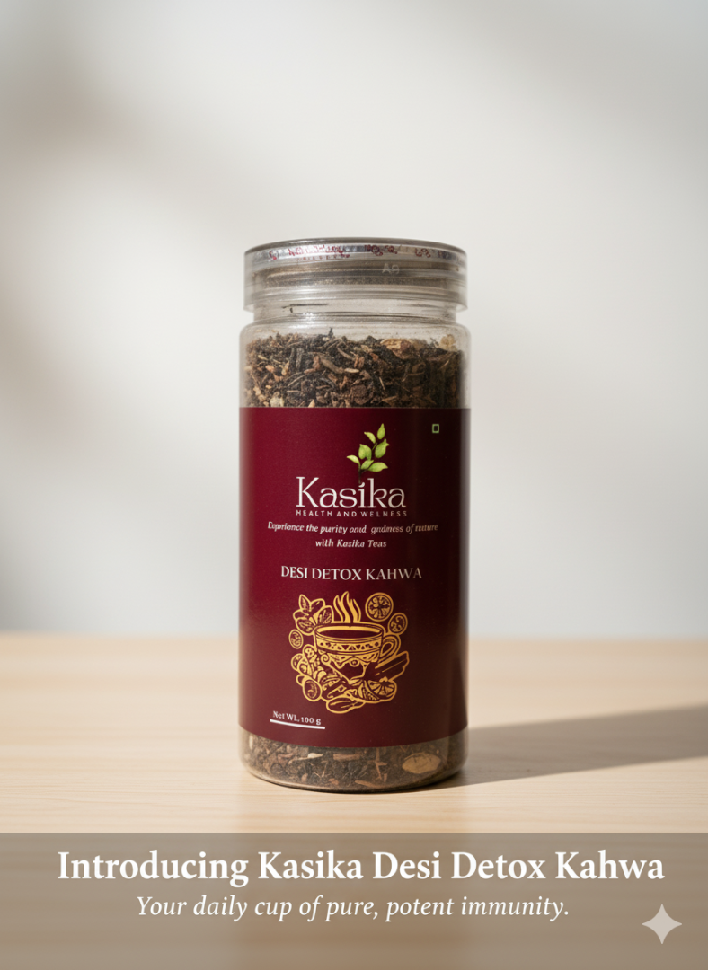 Desi Detox Kahwa: A Heritage Blend for Modern HealthDiscover the powerful simplicity of our Desi Detox Kahwa, a masterful fusion of high-quality Green Tea and the most treasured spices from the Indian kitchen. Rooted in the traditional Indian kadha (herbal infusion), this kahwa is designed to gently support your body’s natural detoxification process and boost your immunity.We've meticulously blended the finest green tea leaves with a harmonious mix of Tulsi (Holy Basil), Ginger, Black Pepper, Clove, Cardamom, and Cinnamon. This aromatic cup delivers a warm, lightly spiced flavor that is both deeply comforting and intensely refreshing.It's more than just a tea—it's your daily dose of wellness. Enjoy a cup to aid digestion after a meal, soothe an annoying seasonal cough or cold, or simply to find a moment of balance in your busy day. Just dip and sip your way to a revitalized you.